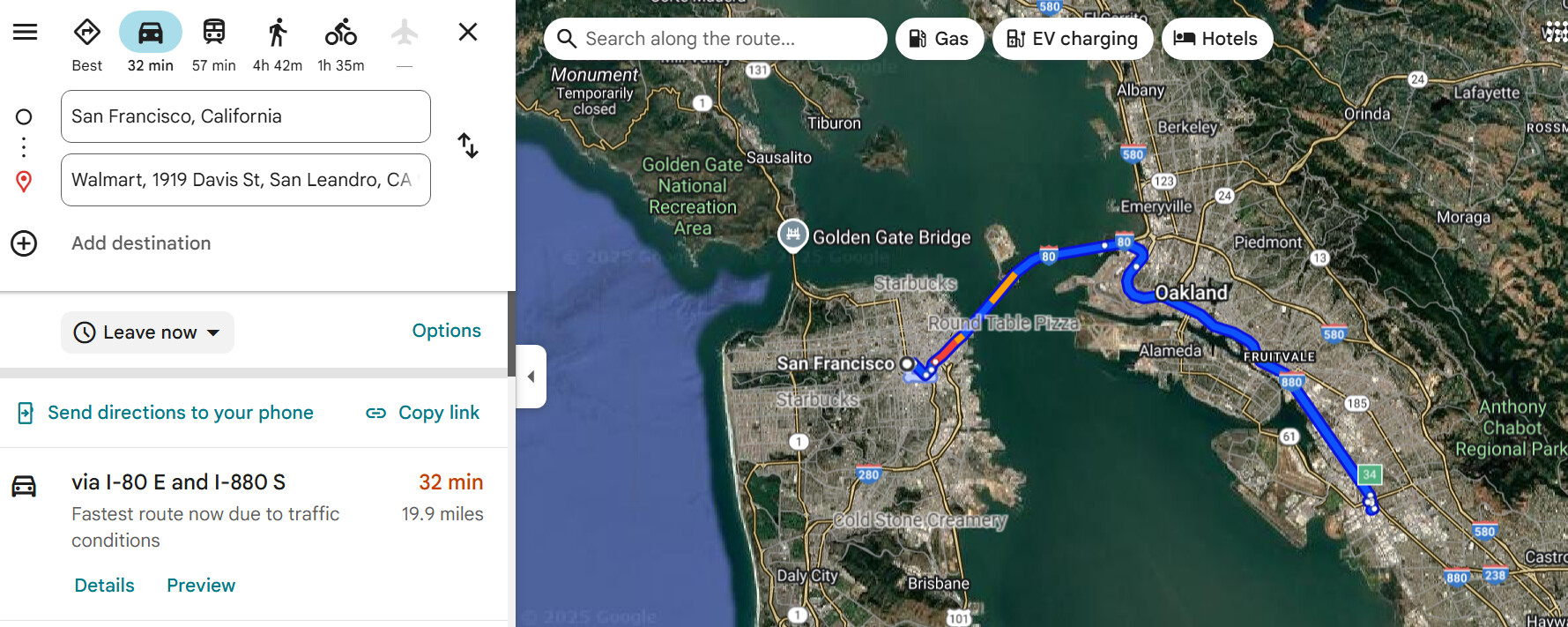 Your closest Walmart is a 30 minute drive, by car, if there is no traffic. CA has a lot of traffic. Its address is: Walmart, 1919 Davis St, San Leandro, CA 94577