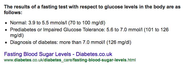 Here’s the range of fasting blood glucose numbers as cited by the UK charity, Diabetes UK:
